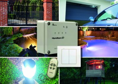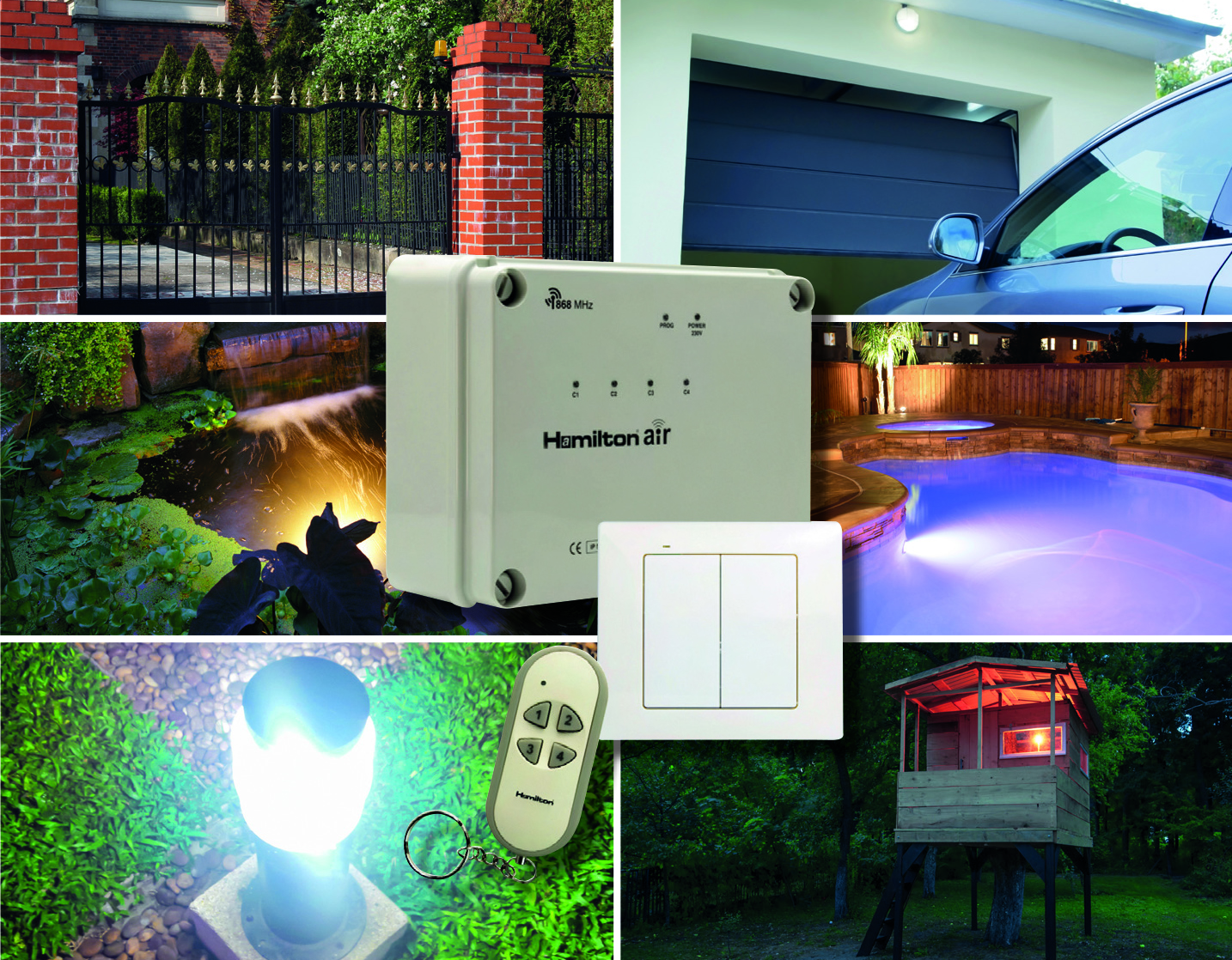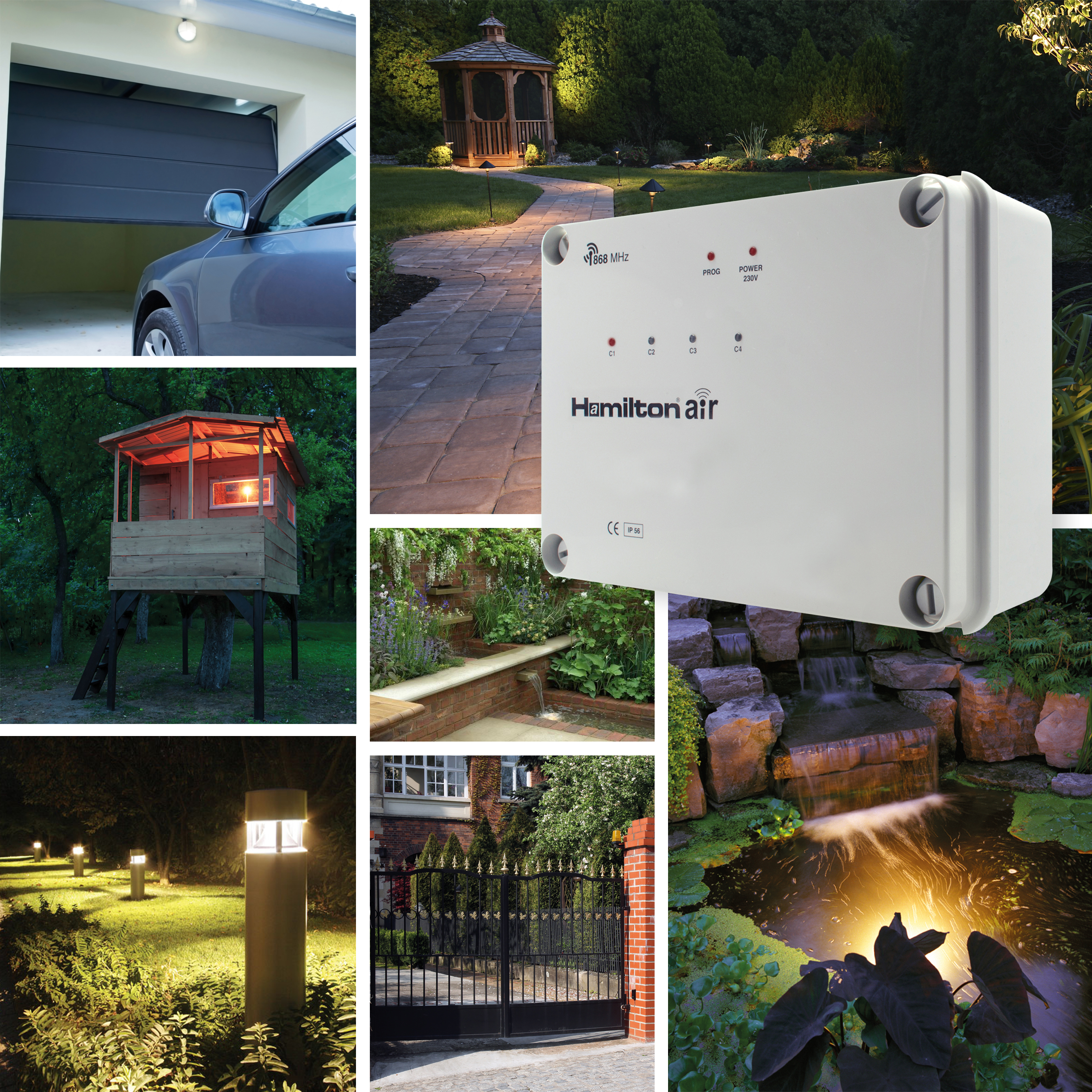 The Hamilton Air 4 channel IP rated wireless switching system can be used to control multiple lighting circuits, garden pumps and other electrical devices. An ideal and simple solution, enabling remote switching to open automatic gates and garage doors. This product is part of the Mercury Air wireless accessories range, and can be controlled using multiple receivers from various remote control handsets and wireless switch plates throughout your home & garden. Features. Remote controlled 4 channel wireless switch receiver for switching on / off household electric appliances including: Lighting circuits, heaters, fans, air conditioners, pumps, garage doors, gates, barriers, optical and acoustic alarm signalling systems.