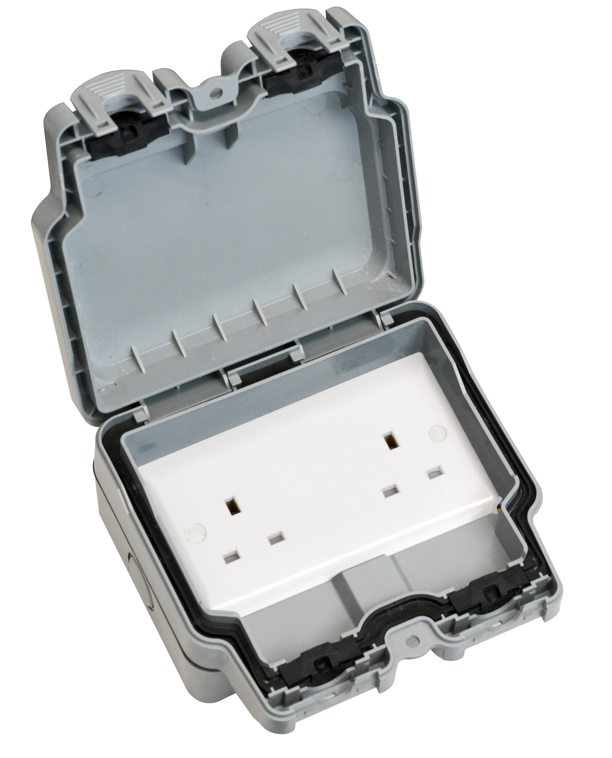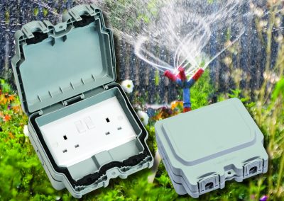A range of weatherproof wiring accessories. Incorporates an easy-to-open latch that ensures the integrity of the gel seal that protects the socket, making it suitable for use in both indoor and outdoor environments where devices are at risk from penetration from water, dust and small particles.